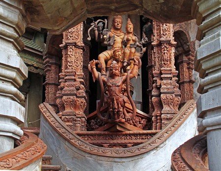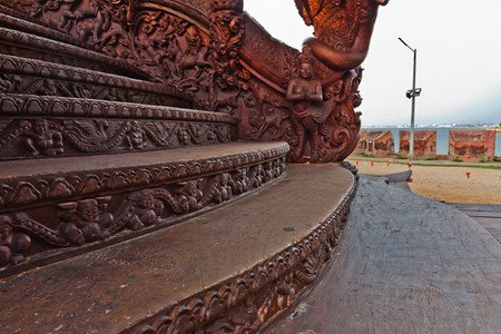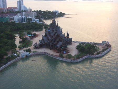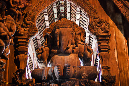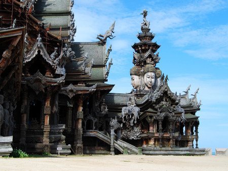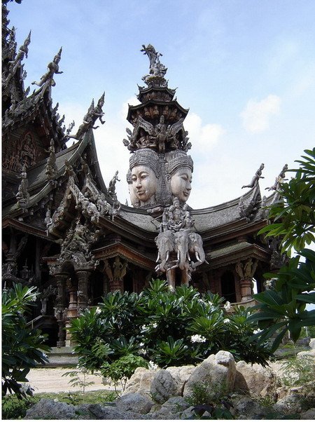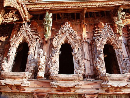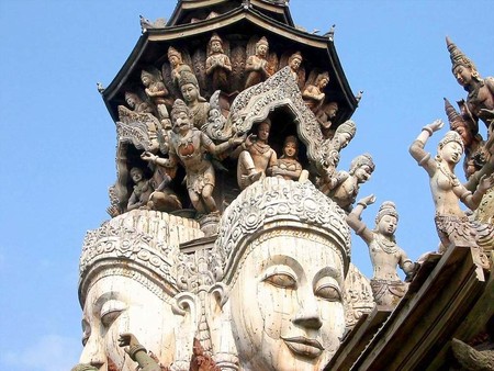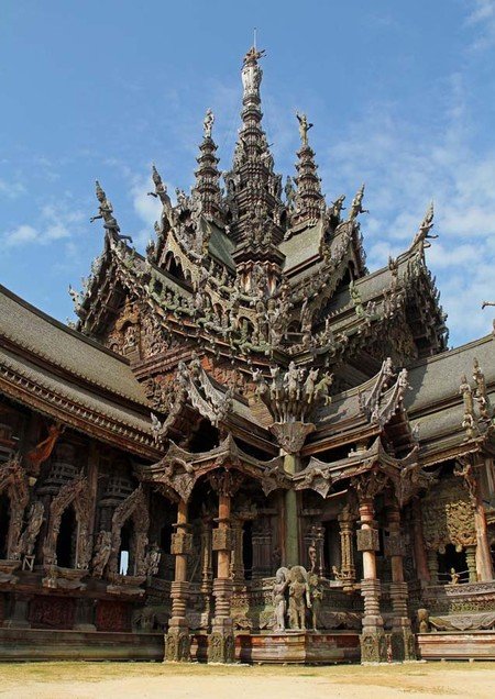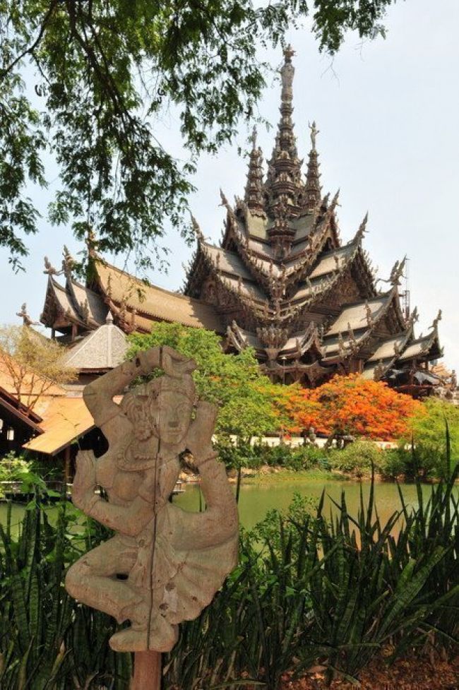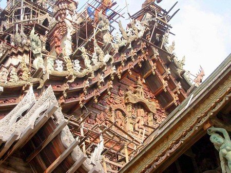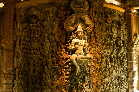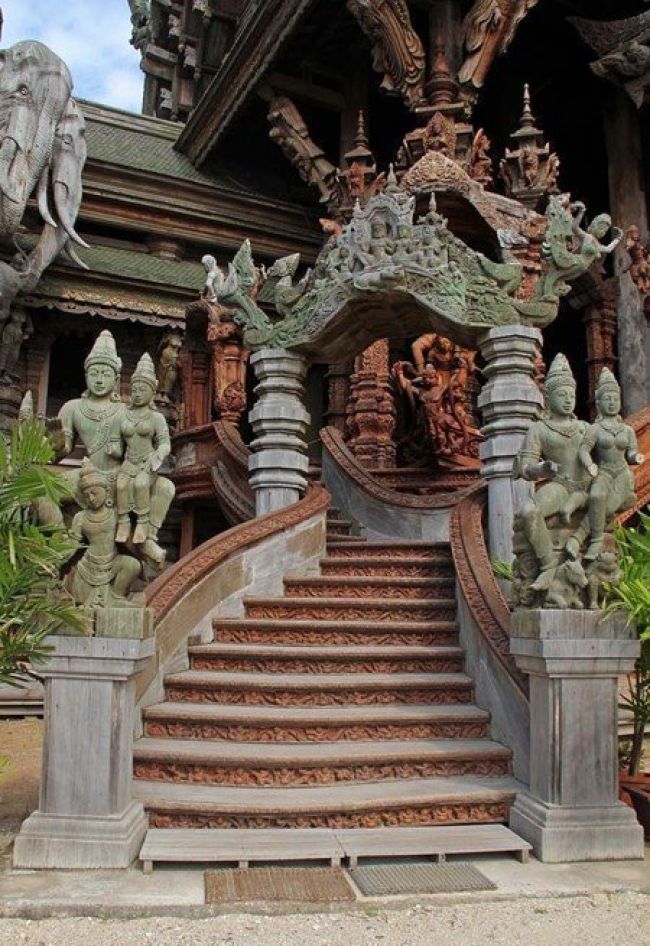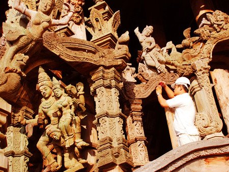 最令人惊叹的是,这座寺庙完全由木材建造而成,而且每一平方厘米的表面都经过了精美的雕刻装饰。 这就是真理之庙。它的独特之处在于:整个建筑都没有使用一颗钉子,而是全部用木雕工艺和各种造型进行装饰。建造工作始于1981年,至今仍在继续。两百多名工匠们一直在不懈地创作那些蕴含哲学意义的木质雕塑和艺术作品。无论是内部还是外部,建筑的每一平方厘米都经过了精心的装饰。