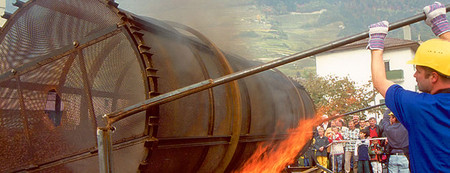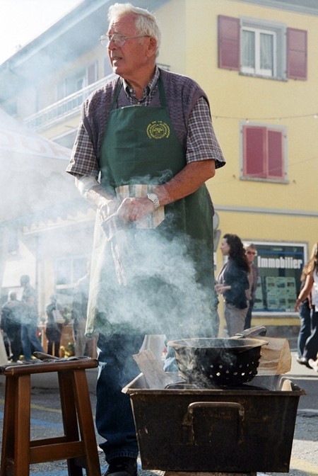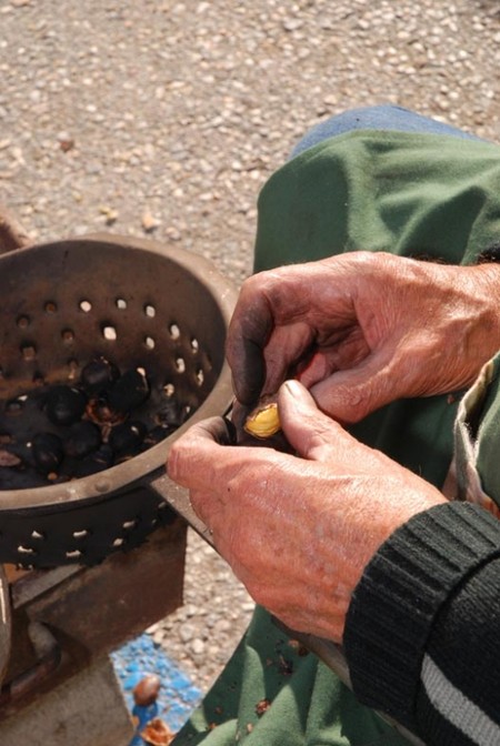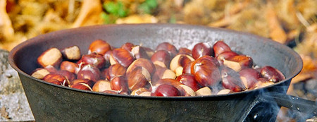 人们用特制的有孔平底锅来烤栗子……