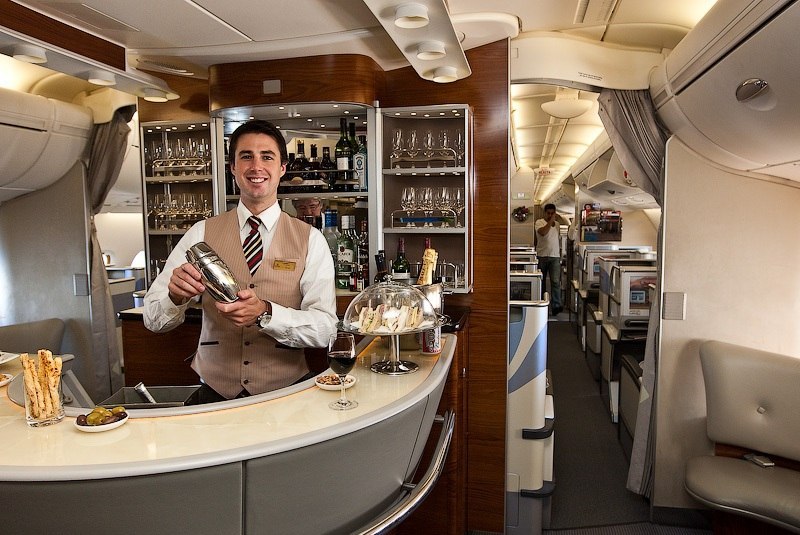 机内设有两间酒吧,头等舱乘客还能使用两间淋浴间和10间卫生间,其中经济舱也配备了10间卫生间。