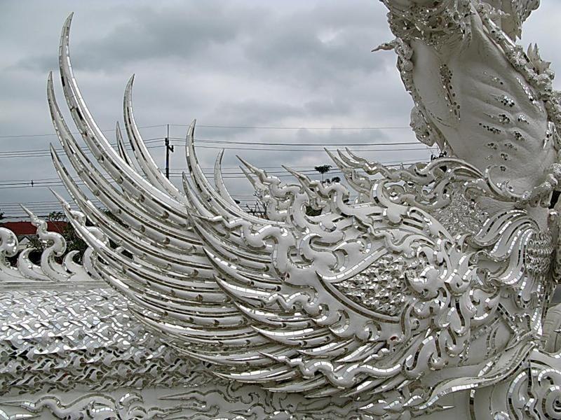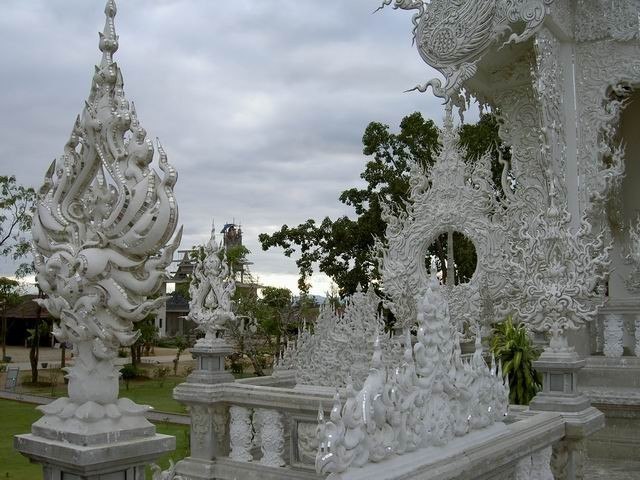 瓦隆坤寺是泰国唯一一座完全呈洁白色调的寺庙,其白色墙面中镶嵌着玻璃马赛克,这些玻璃在阳光下会闪烁出耀眼的光芒。建造这座纯白宫殿的想法源自泰国著名艺术家哈勒姆海·科西特皮帕特——他花费了20年的时间,通过出售自己的画作积攒资金来实现这一梦想。白色象征着佛陀的纯洁,而那些在阳光下闪耀的玻璃则寓意着佛陀的智慧,这种智慧“照亮了整个地球与宇宙”。