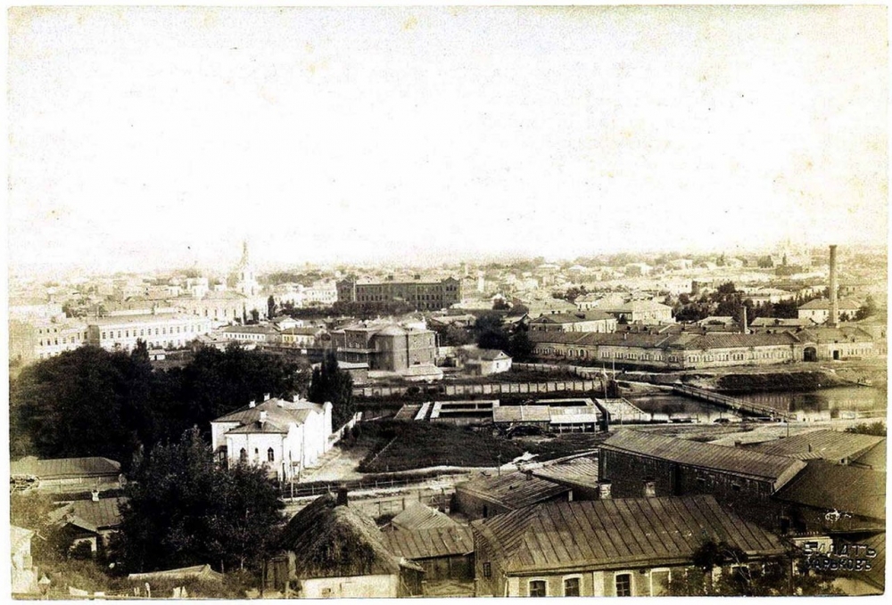 I believe that I am not alone in having trouble identifying the places depicted on this postcard. It turns out that the reasons for these difficulties are largely of an artistic nature. The artist took too much liberty in altering the outlines of some buildings, while the publisher mistakenly identified the location where the photograph was taken, which influenced the name of the postcard. In reality, the shooting was not conducted from Cholodnaia Gora but rather from the Zhuravlyovskie slopes (perhaps on Kulikovskaya Street). As a result, what flows in the background is not the Lopan River, as one might expect based on the name on the postcard, but rather the Kharkov River. Moreover, the footbridge in the right part of the image connects Chernoglazovskaya Street with Voznesensky Perewalk. The building in the center of the picture is none other than a real school, which faces the Voznesenskaya Church with its back side. The artist increased the length of this building by nearly twice, making it completely unrecognizable. The faint outlines of a church to the south of the school, near the right edge of the photograph, are likely those of the Mikhailovskiy Temple. The large two-story building on the left side of the image is the Second Women’s Gymnasium.