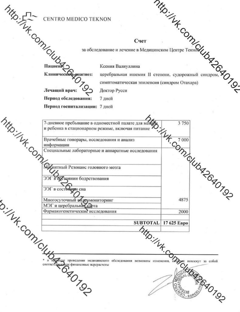 Wir haben eine hervorragende Klinik in Spanien gefunden: http://www.teknon.es/ Wir haben viel Arbeit in die Suche nach Berichten und Informationen über diese Klinik sowie die dort tätigen Neurologen investiert. Die Klinik in Spanien hat uns zustimmend geantwortet. Nach mehreren Telefonaten und Gesprächen, in denen Xenias Krankengeschichte und Untersuchungsergebnisse besprochen wurden, stimmten die Ärzte in Spanien zu, uns aufzunehmen. JETZT BESTEHEN GROße CHANCEN ON EIN NORMALLES LEBEN! Doch unsere finanzielle Situation ist völlig aussichtslos. Die Leistungen für behinderte Kinder reichen nur für grundlegende Medikamente und Windeln. Deshalb muss die Familie von Xenia um Hilfe bitten.