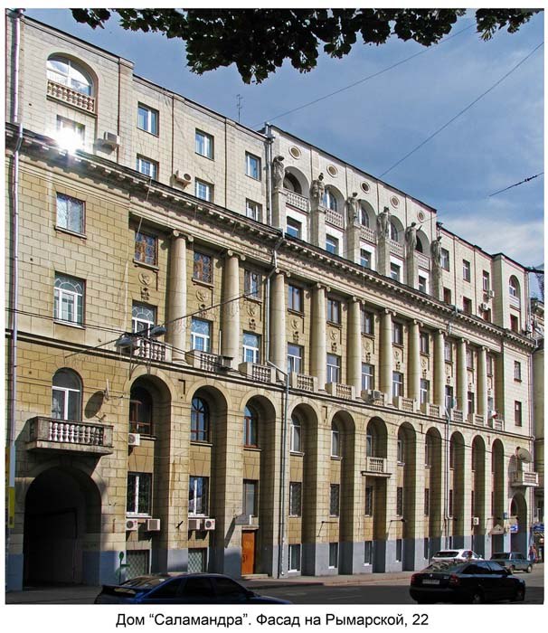 Versicherungsgesellschaften – darunter auch die „Salamandra“ – investierten gerne Mittel in die Entwicklung von Miethäuserkomplexe, da Immobilien immer noch einer der zuverlästensten Methoden zur Aufbewahrung und Anspaarung von Kapital sind. Zu diesem Zweck erwarb die Charkiwer Niederlassung der „Salamandra“-Gesellschaft im Jahr 1914 vom Adligen N. A. Sochawa ein großes Grundstück im Stadtzentrum zwischen der Sumskaja-Straße und der Rymskaja-Straße und beauftragte das Architektenkollektiv in Petersburg mit der Organisation eines Wettbewerbs für den Entwunf des Miethauskomplexes. An dem Wettbewerb nahmen 24 Entwisseße teil. Den ersten Preis erhielt ein Projekt von junger Architekten – Studenten der Petersburger Akademie der Künste, M. Redkin und D. Berdnikow – doch ihr Entwurf wurde vor der Bauausführung vom berühmten Petersburger Baumeister N. N. Werojewkin überarbeitet. Werojewkin hatte bereits zuvor für die „Salamandra“ in Russland mehrere Gebäude errichtet, darunter Miethause in Petersburg (Gorochowaja-Straße 4) und Omsk (Musejna-Straße 4/ Karl Liebknechtstraße 3).