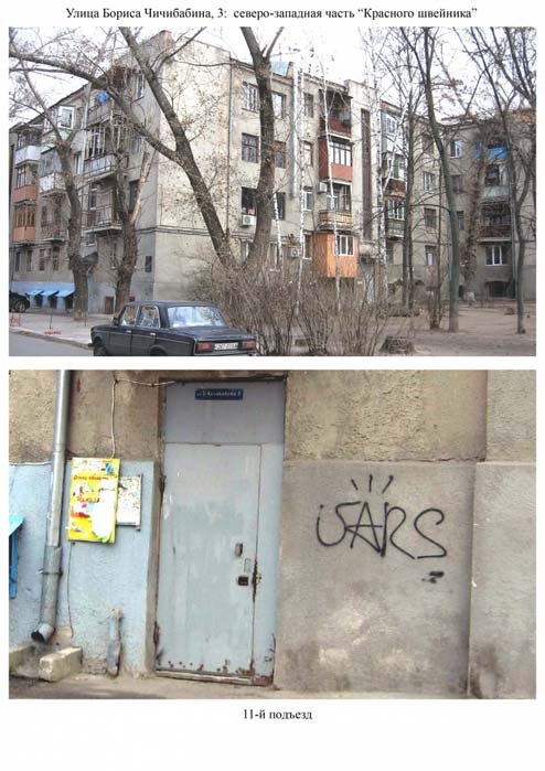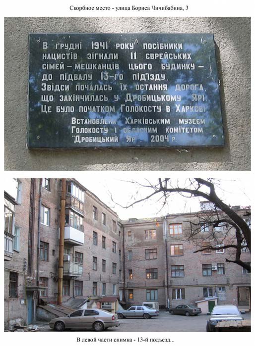 ] Das Gebäude weist eine komplizierte, „Käfer“-ähnliche Struktur auf und verfügt über insgesamt 13 Eingänge. Die heutige Karte von Charkiw weist fälschlicherweise nur zwei Abschnitte mit jeweils zwei Eingängen unter der Adresse Čičibabina 3 aus. Tatsächlich führen alle Abschnitte des „Schwejnik“-Blocks sowohl auf die Čičibabina-Straße als auch auf die Danilevskij-Straße; alle haben die Adresse Čičibabina 3 (siehe Foto des 11. Eingangs, der auf die Danilevskij-Straße führt). Dieses Gebäude ist in die Liste der Trauerstätten der jüdischen Bevölkerung Charkiwes aufgenommen, was durch eine Gedenktafel belegt wird. In diesem Haus, im 11. Eingang, lebte von 1929 bis 1940 der bereits erwähnte berühmte Charkiwer Jakow Gelfandbein. Hier ist ein kurzer Auszug aus seinem Buch „Der Fluss der Erinnerungen“ über diese Jahre seines Lebens: „Hier befindet sich das Gebäude ‚Schwejnikov‘ an der 2. Koltseva-Straße, dem Namenstag des 8. Sowjetskongresses – die Wiege meiner Schuljahre in den 30er Jahren… Hier ist auch mein Fenster im dritten Stock, das nach Westen geht, sowie der kleine Balkon. Auf diesem Foto, vermutlich aufgenommen vom gleichen deutschen Piloten, ist das Gebäude im Vordergrund, in der Mitte zu sehen; sein heller, quadratischer Baukörper fällt sofort ins Auge. Für uns war dies damals ein wahrer Palast – nachdem wir zuvor in einer winzigen Zimmerchen auf der Malogončarovska-Straße gelebt hatten, nur fünf Meter groß und mit kleinen, dunklen Fenstern… Sonnenschein, viel Luft und Licht – die Welt schien uns hier wie auf einem Tablett zu liegen. Vom Balkon aus, diesem geliebten Ort der Erholung, konnten wir in den verbotenen Spazierstunden einen guten Überblick über Teile Charkiwes erhalten: die Gebiete unterhalb der Klotschkovskije-Hänge, die Lysaja- und Holodnaja-Gora-Berge sowie die massive Ziegelbauweise der Holodnogorskaja-Kirche. Nach links blickte man auf den Kuppel des Südbahnhofs und auf das weiße Gebäude der Holodnogorskaja-Gefängnis, das von allen Seiten sichtbar war. Nach rechts öffnete sich der Blick in die Ferne – in die Hauptstadt unseres Vaterlandes, jene damals geheimnisvolle Moskau…“ Und aus einem privaten Brief: „Alle Blöcke meines Hauses sind im Grunde genommen identisch und unterscheiden sich nur durch individuelle Merkmale… Mein Block ging auf die Danilevskij-Straße hinaus. Lassen Sie uns über die Čičibabina-Straße in den Hof des Gebäudes Nr. 3 gehen und dann unter den Eingang treten, um in den Garten auf der Danilevskij-Straße zu gelangen. Entlang der rechten Wand gehen wir bis zum Eck und biegen dann direkt nach rechts ab – der erste Eingang auf der rechten Seite, dritter Stock; wenn man von der Fassade aus schaut, links, Hausnummer 78. Das Küchenfenster und der Balkon…“ Adresse: Boris-Čičibabina-Straße 3. Quelle: vk.cc/1Xvnxb.