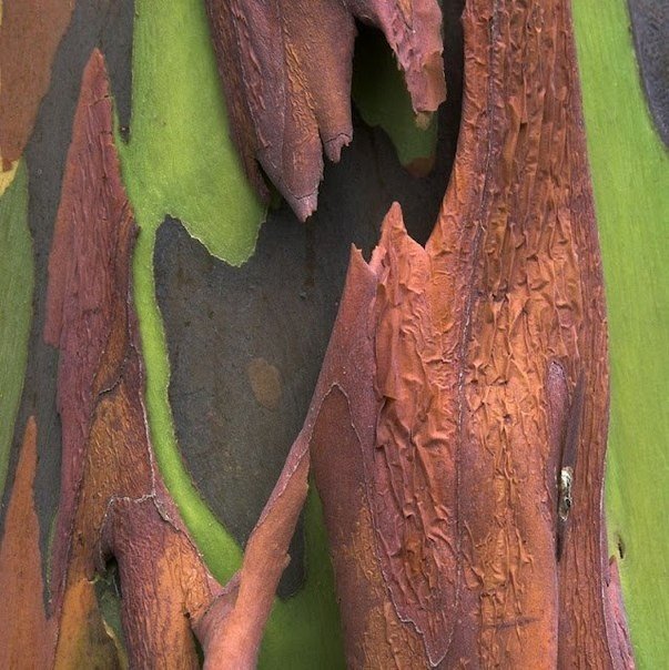 Die Rinde dieses Baumes kann in Gelb, Grün, Orange oder Lila gefärbt sein. Der Regenbogen-Eukalyptus ist die einzige Art von Eukalyptus, die im nördlichen Halbkugel wächst. Dieser „Regenbogen-Effekt“ entsteht dadurch, dass sich die Rinde allmählich in schmale Streifen ablagt und an ihrer Stelle nach und nach neues Rindenmaterial bildet. Im Laufe der Zeit ändert die Rinde ihre Farbe.