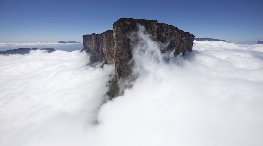 The Roraima Table Mountain is located at the junction of Brazil, Venezuela and Guyana. Its main feature is that a large cloud is constantly hovering over the mountain.