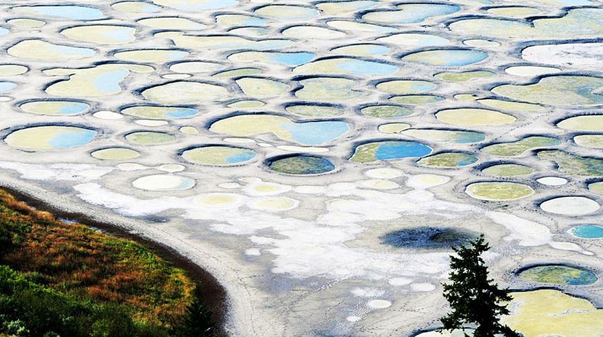 Spotted Lake water near the town of Osoyus is also called Kliuk. Its water is saturated with various minerals and has the world's largest concentration of magnesium sulphate. Due to this, during the summer, spots of various shapes and colors are formed on the surface of the lake during evaporation.