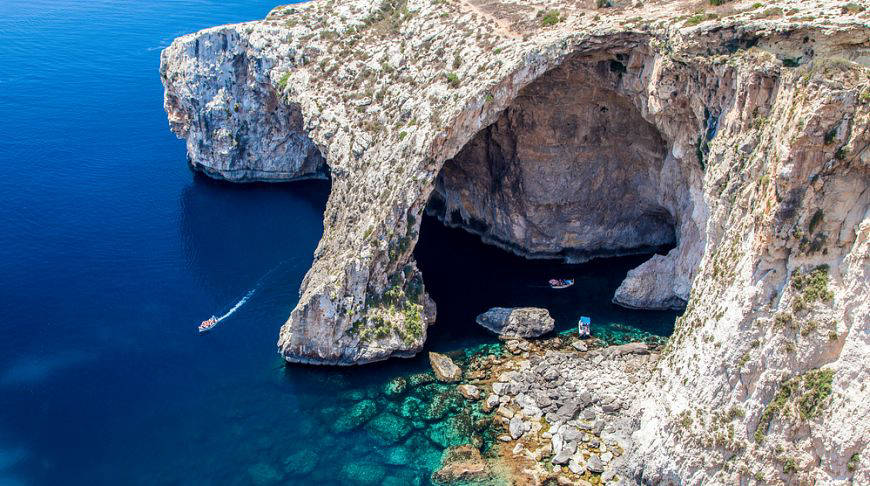 The Blue Grotto is the main natural landmark of Malta. It is a system of caves and coves in white limestone cliffs. The porous rock works as a filter and around the clock cleans the water around the grotto, giving it an unusual blue tint.