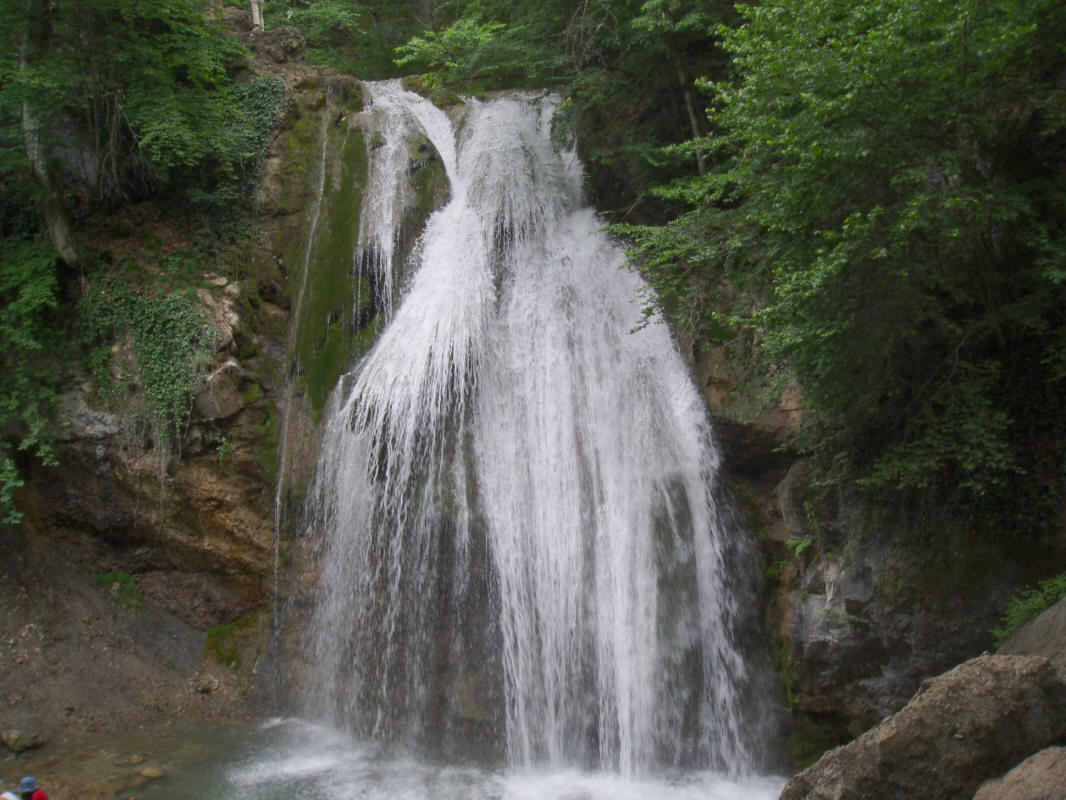 Jur-Jur waterfall is the most powerful and inimitably picturesque waterfall in the Crimea. It does not dry out even in the most arid years. In the gloomy gorge, the Ulu-Uzen River runs along a three-stage threshold, falling from a hundred-meter height. From the limestone ledge, which is 15 meters high, the water is sweeping a wide 5-meter steep stream into a deep foundation pit, and from there it rushes into the river bed. The waterfall justifies its name (the Greeks called it Kremasto Nero - "hanging water"): it does not rumble, it does not rustle, it's gurgling, the streams of water do not fall swiftly, but as if they slide down, breaking at the foot of the ledge and forming in the ice dust playing a rainbow. The grandeur and severity of the surrounding mountains, the Jur-Jur frothy jets, colored by the rays of the sun and beautifully stand out against the greenish background of rocks covered with moss, enchant the traveler; far around the noise of falling water is heard ... Having passed from the Jur-Jur waterfall upstream of the river about a kilometer, one can see a whole series of picturesque rapids-kascadres. The most beautiful of them are the upper ones - the penultimate and the last, with a height of about 30 and 60 meters. Nearby - a cave Jur-Jur length of 750 m. And around - an old high-growth forest of beech, hornbeam, with an admixture of oak, linden, mountain ash, cornelian, hazel. The dusk of the beech pad is in harmony with the gloomy cliffs of the surrounding mountains. The sites of the old 200-year-old forest from the rock oak, the groves of the Crimean pine are of special scientific value in the reserve.