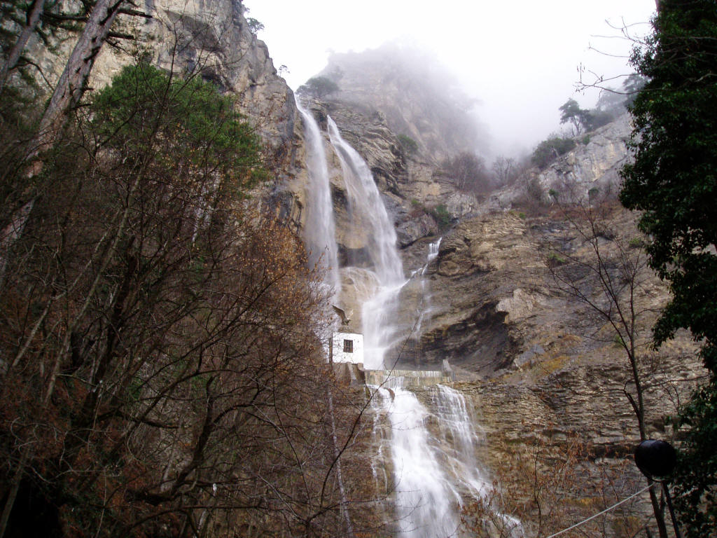 Wuchang-Su (its name is translated from the Crimean-Tatar language as "flying water"), the largest in the Crimea, is located about 7? 8 km from Yalta, in the mountains. The Wuchang-Su River originates in limestones under a cliff of yail at an altitude of 1233 m above sea level and in the upper reaches is characterized by a very large fall. At an altitude of 390 m above sea level, it forms the Wuchang-Su waterfall, whose water falls from a height of 98 m. A particularly spectacular sight is the Wuchang-Su in spring and late autumn, when a huge mass of foamed water collapses with force, sometimes entraining large stone blocks. A cloud of water dust hangs over the waterfall, and the noise of the stream is heard for a kilometer. In the dry summer period, the silver ribbon of the waterfall dries out, giving way to weak jets of water running down the gray rocky surface. But the high-standing age-old pine trees surrounding the waterfall are always beautiful, like all the surrounding nature and healing mountain air, filled with the smell of resin.