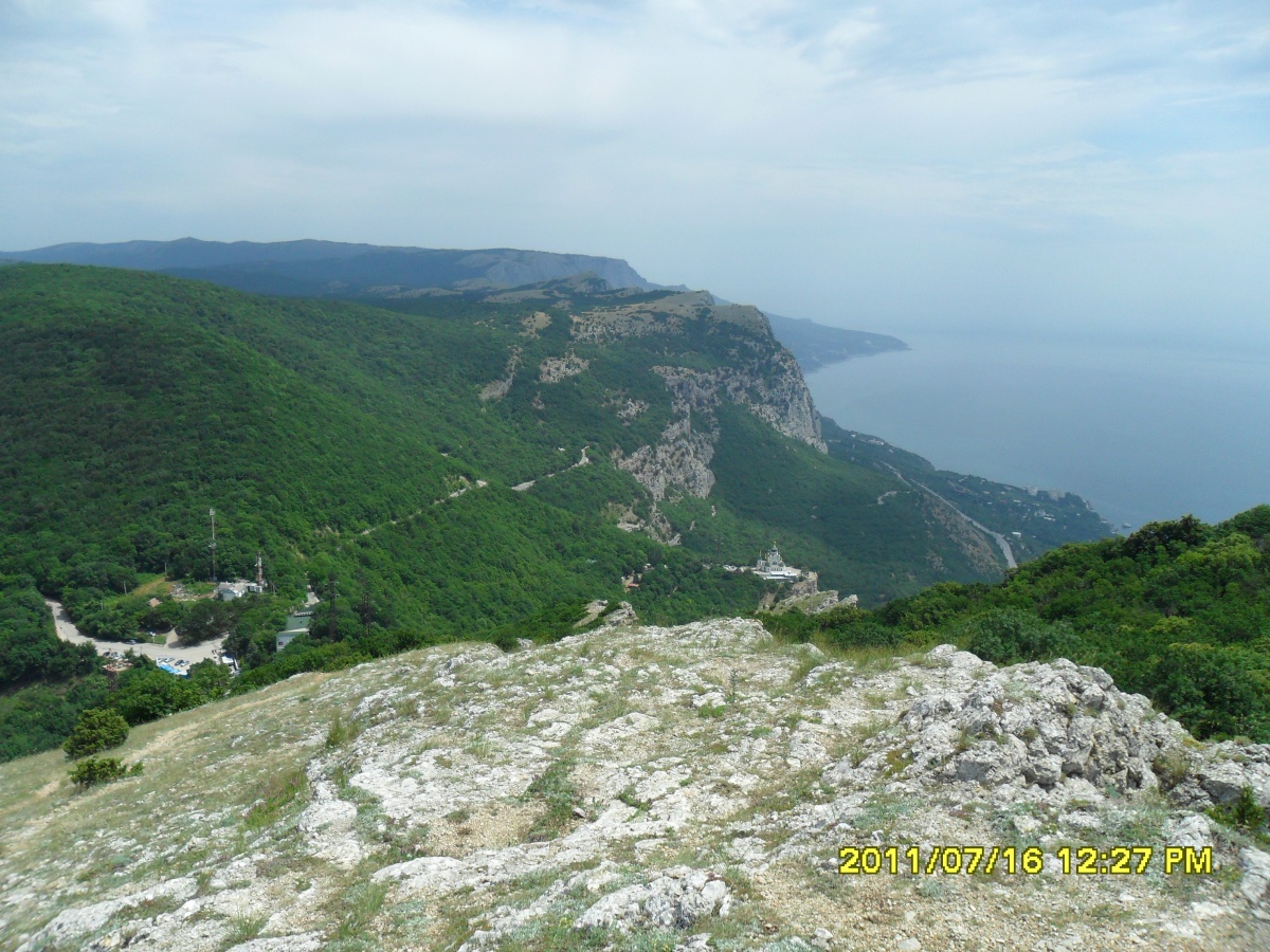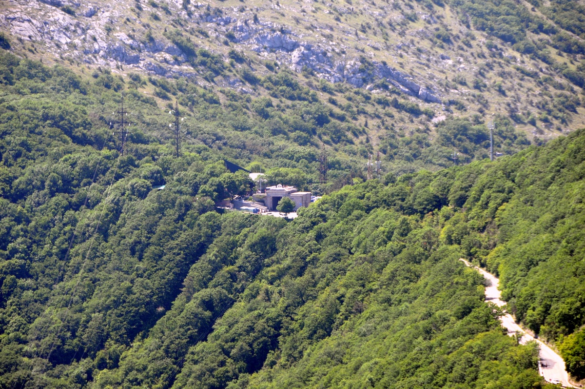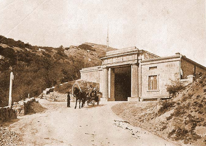 Now on this road they go only for the sake of these Baydarsky gates themselves. Baidar Gate is a mountain pass through the main range of the Crimean Mountains, leading from the Baydar Valley (often called Crimean Switzerland) to the southern coast of the Crimea. Pass Baidar Gate or simply Baydar Pass is located between Mount Chelebi (657 m) in the west and Chhu-Bair (705 m) in the east. The height of the pass is 503 meters above sea level. Until 1917 and in the 20s - 30s of the 20th century, Baidar Gate had two hotels. The first - to the left of the gate, the second - beyond the gate, to the right of them over the cliff edge. There was also a post station with a room for travelers, a separate pavilion-restaurant was built to the left of the gate. Today, the Shalash restaurant is located near the Baydar Gate. Through the pass passes the old highway Yalta - Sevastopol, built from 1837 to 1848. on the initiative of the Governor-General of the Novorossiysk Territory Count Mikhail Semenovich Vorontsov.