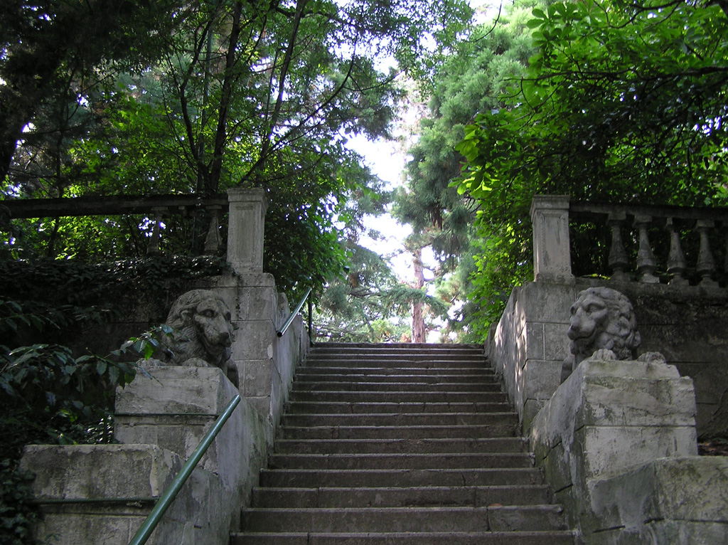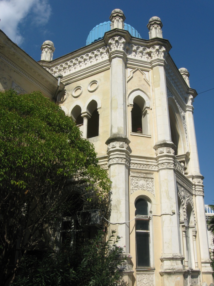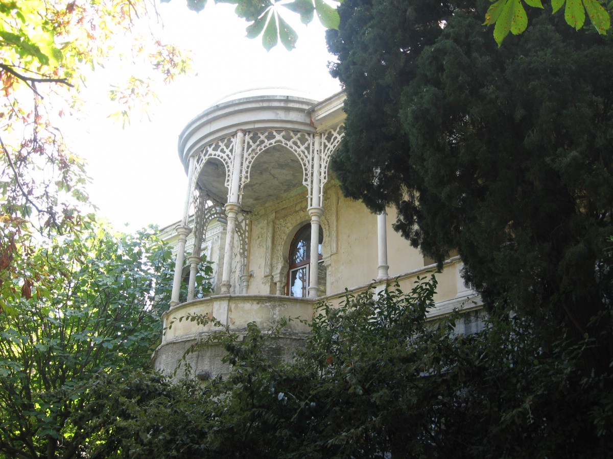 , becoming the residence of Emir of Bukhara Noble on the southern coast of the Crimea. The building was built according to the project of urban architect N. G. Tarasov and is a two-storeyed building made of Kerch stone in Moorish style, in which rectangular, faceted and semicircular volumes, porticoes and terraces, balconies and belvedere organically combine. They complement the Moorish style of the Emir's palace and the openwork carvings of columns with exquisite capitals, balustrades, as well as framing of horseshoe-shaped windows and a dentate parapet over the eaves. The site for the construction of the emir of Bukhara acquired at the end of the XIX century and laid the park on it, as well as 4 buildings, of which only the palace survived to this day. The estate, which Emir of Bukhara himself called Dilkiso (Turkic - captivating, fascinating), remained in his property (until his death in 1911) and his eldest son - until 1917. After the establishment of Soviet power, the building was nationalized. On March 25, 1921, the Eastern Museum of Yalta was opened here. The palace buildingwas badly damaged during the years of the fascist occupation. Aerosolarium and weather station were destroyed. The park suffered significant losses. In the early 1970's, in addition to restoration work, repair and restoration work was carried out. At present, a monument of architecture of the XX century - the former palace of Emir of Bukhara - is one of the buildings of the military sanatorium Yalta, which serves as a library for holidaymakers. Therefore, unfortunately, access to the inside of the building for tourists is problematic.