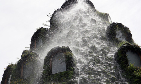 Desde la cima del hotel, un chorro de agua brota con fuerza, como si saliera por la boca de un volcán.