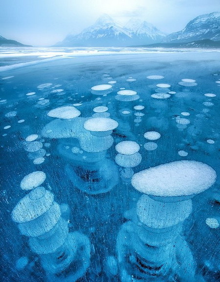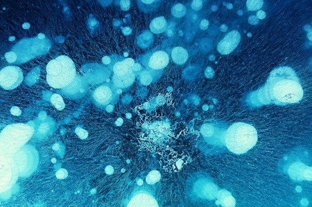 Y con el frío llega un fenómeno maravilloso: la superficie del lago se congela junto con las burbujas de aire que emergen desde el fondo. Estas burbujas contienen metano, un gas producido por la actividad de las plantas acuáticas. El tamaño de estas burbujas varía y son muy numerosas. Se dice que caminar sobre esta superficie helada y bellamente decorada es realmente impresionante: no se puede ver el fondo, solo largos columnas de burbujas blancas que parecen surgir de la nada. Cuanto más frío hace, más profundo se congela el lago y más largas se vuelven estas columnas de burbujas. Además, la superficie está llena de grietas y fisuras. Es hermoso y fascinante… pero uno realmente desea salir cuanto antes a una orilla segura.