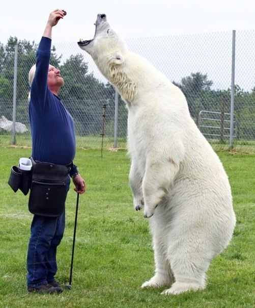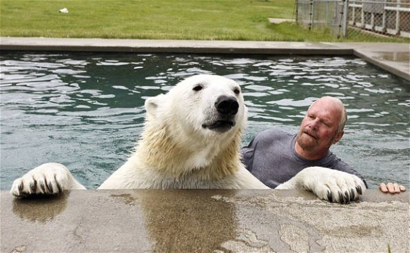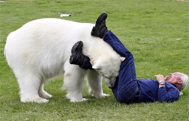 Los científicos no comprenden cómo es posible algo así. El hombre ha establecido relaciones amistosas verdaderamente increíbles con un oso polar blanco. Mark lucha con Eiji y hasta le coloca su cabeza en la boca. Quizás todo se deba a que, hace 16 años, Mark y su esposa llevaron a casa a un osito de seis semanas y lo alimentaron con leche en biberón.