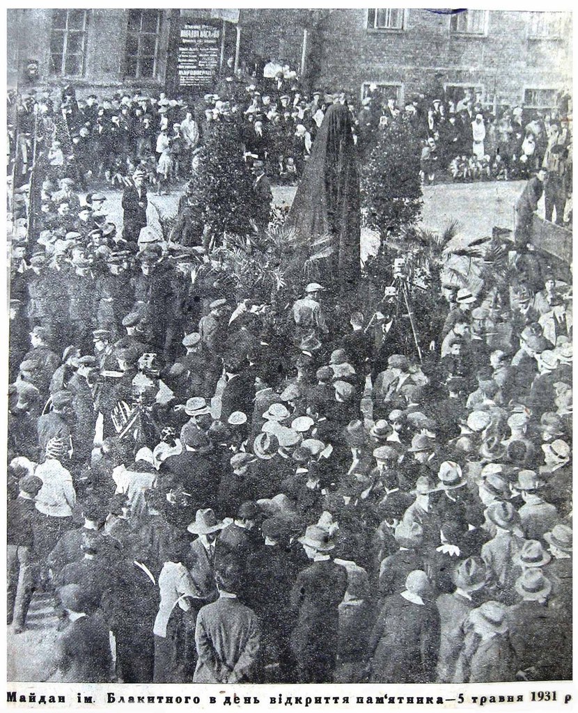 On a small, unnamed square, at the intersection of several streets near the post office, a monument to the Ukrainian writer V. M. Blakitny (Ellan) was unveiled on May 5, 1931. The bust was crafted from bronze, while the pedestal was made of black Ukrainian labradorre dogs (sculptor: M. A. Novoselsky). Due to this, the square was named after Blakitny.