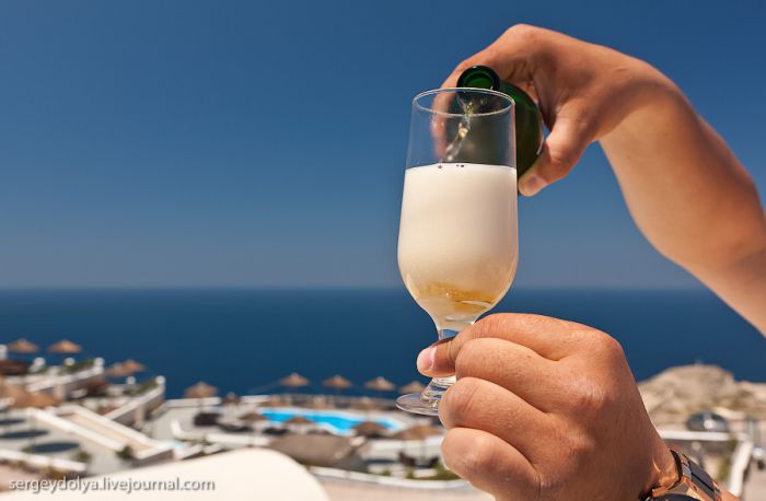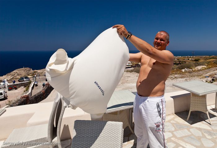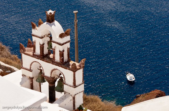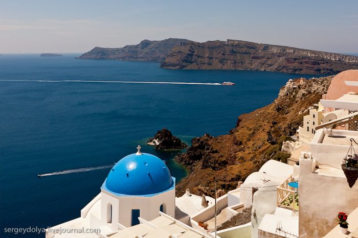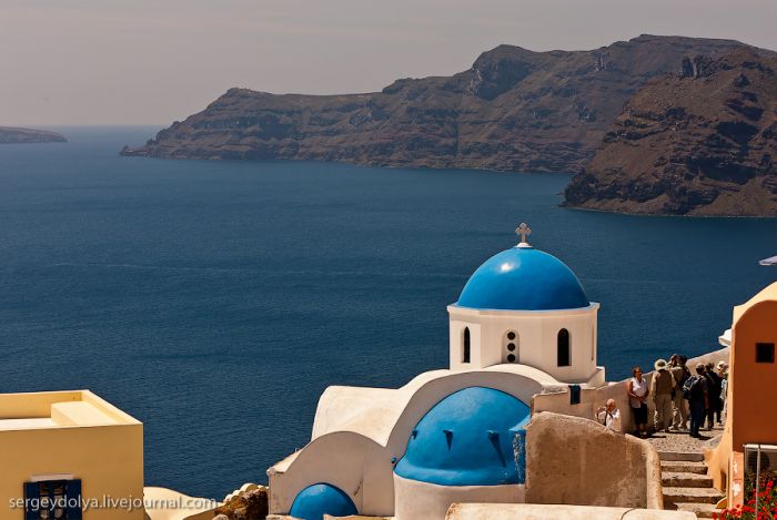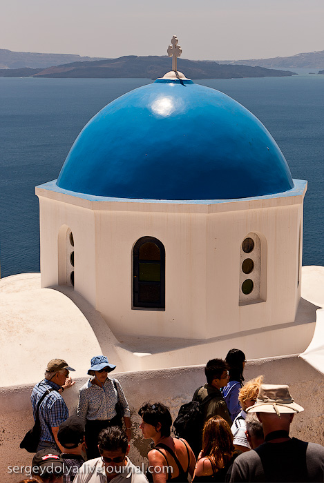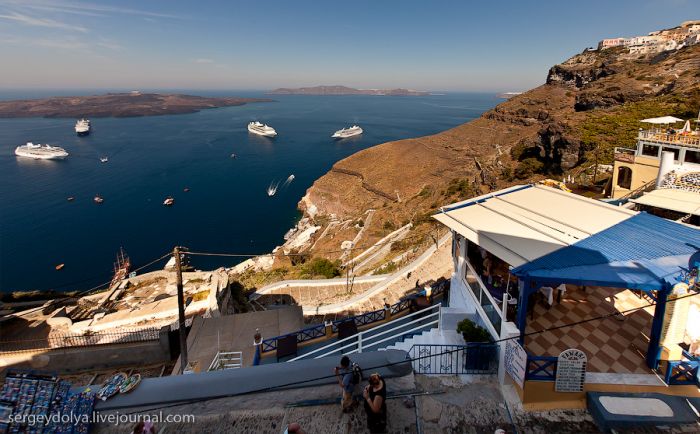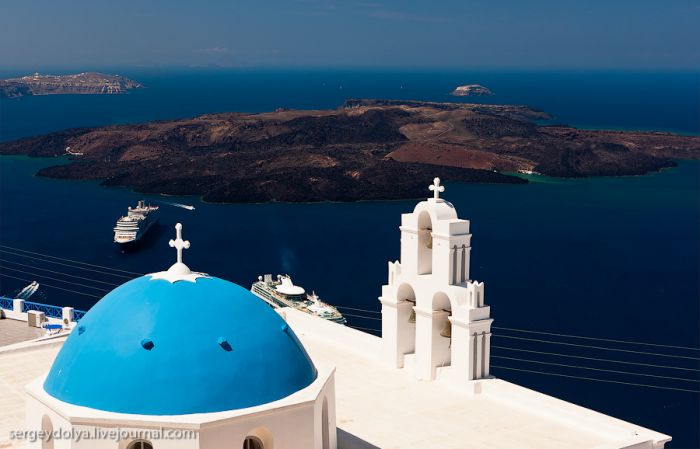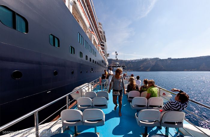 Santoriní est probablement l’île grecque la plus connue. Chaque année, elle attire des millions de touristes attirés par la couleur azurée incroyable de ses églises. La dernière fois, je suis arrivé ici par temps de pluie, et cette fois, c’est le soleil de midi brûlant qui a gâché mes photos… À Santoriní, il n’y a pas de quai capable d’accueillir de grands paquebots océaniques ; donc, on nous a envoyé de petits bateaux :