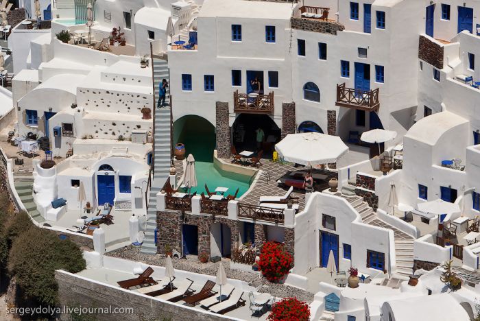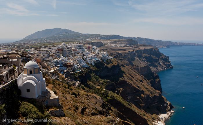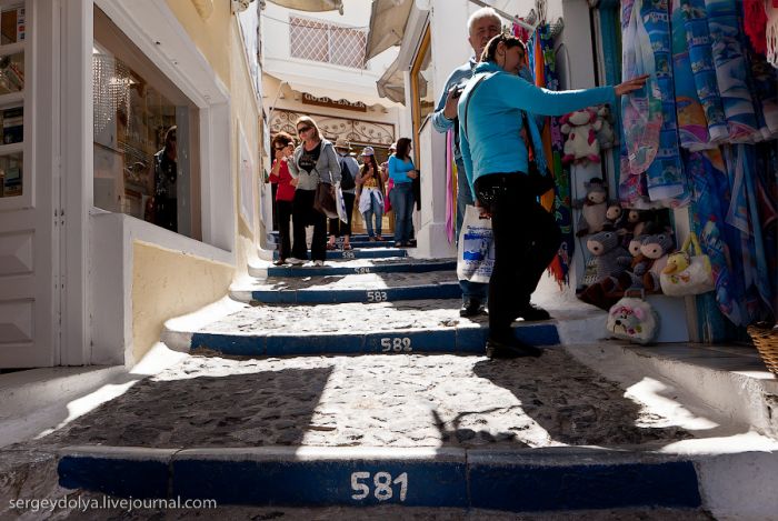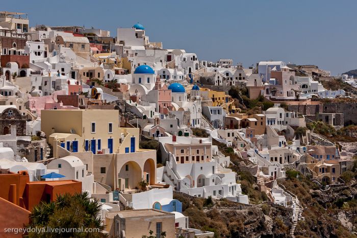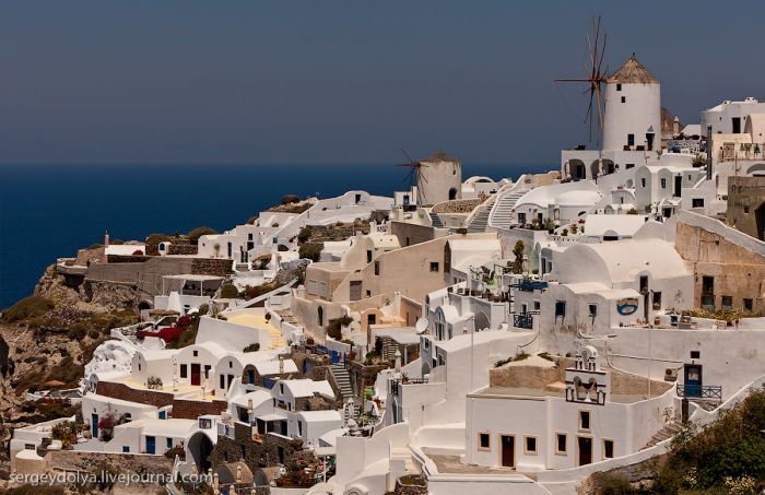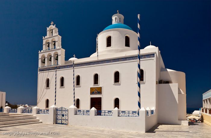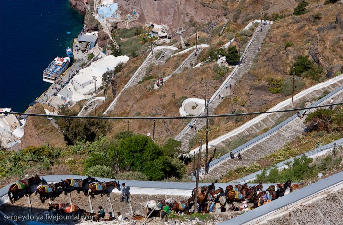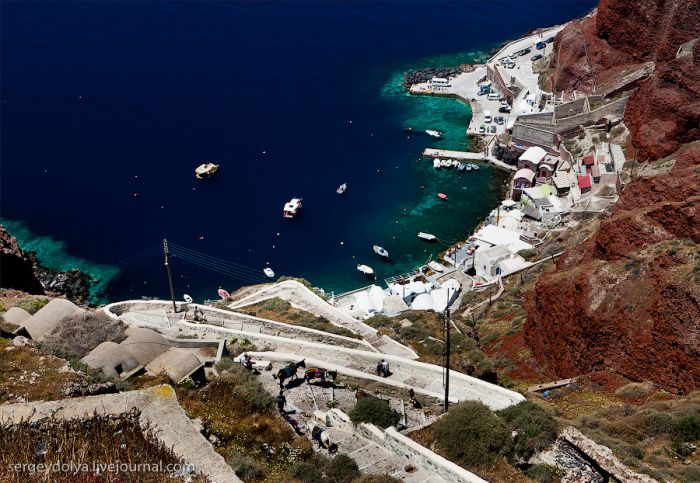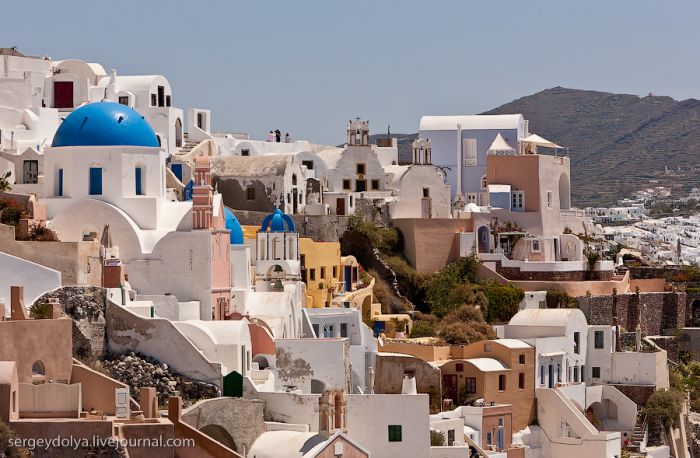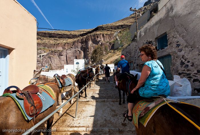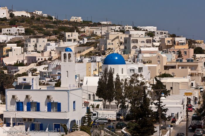 Généralement, les touristes visitent deux villes : Fira et Ia. Fira est plus grande, et c’est par ce chemin, avec le téléphérique, que les touristes y sont amenés ; mais elle est moins belle et intéressante du point de vue architectural :