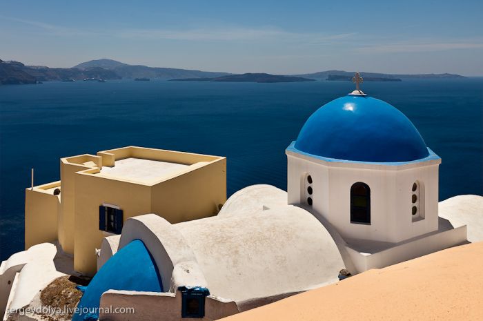 Le ciel bleu au-dessus de Santoriní correspond exactement à la teinte des portes et des fenêtres bleues des églises : 1