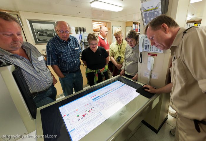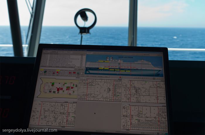 C’est d’ici que sont gérés les moteurs ainsi que tous les autres équipements du navire. Vous vous souvenez du capitaine du Titanic qui actionnait une manette spéciale pour faire fonctionner les machines, tandis que les ouvriers dans les chaudières ajoutaient du charbon dans les feux ? Aujourd’hui, tout est géré par ordinateur…