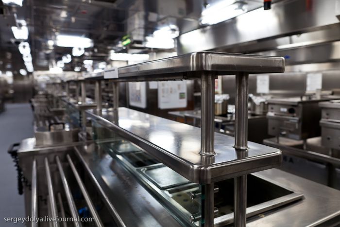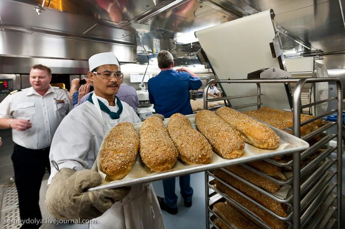 Tout le pain est cuit à bord. Six boulangeries fonctionnent 24 heures sur 24. Au total, il y a 798 membres d’équipage à bord du navire ; 334 d’entre eux, y compris les serveurs, travaillent dans la cuisine…