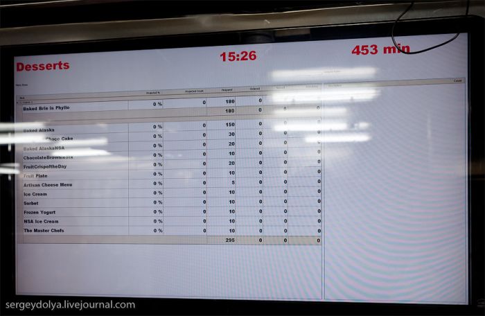 Avant le début du dîner, le nombre de portions de chaque plat est déterminé en fonction des statistiques des croisières précédentes. Lorsqu’une commande est reçue, l’information apparaît immédiatement sur l’écran central, ce qui indique aux cuisiniers quelle quantité de chaque plat il faut préparer…