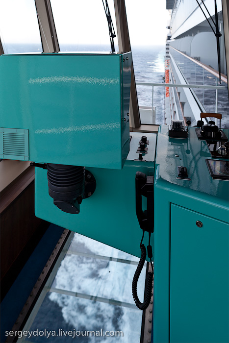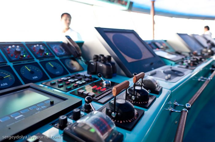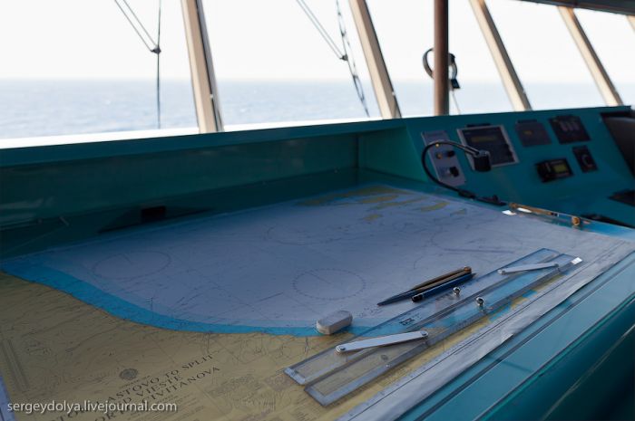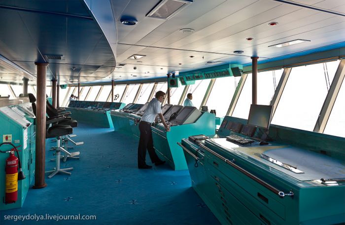 On peut voir clairement les cinq cloisons dont j’ai parlé au début de cet article. L’objet rond sur le pare-brise est un essuie-glace spécial : même en cas de pluie torrentielle ou lorsque des vagues frappent le pare-brise – qui se trouve à la hauteur du 8ème étage du navire – cet essuie-glace permet toujours de voir ce qui se passe devant…