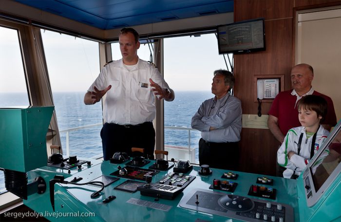 Nous avons visité la salle des machines, la cuisine, les loges des artistes, la blanchisserie, le atelier de serrurerie, les entrepôts et presque tous les locaux annexes. Nous avons vu où vivaient les matelots. La visite s’est terminée sur le pont du capitaine. J’avais déjà écrit sur l’aspect intérieur d’un paquebot de croisière et sur les activités qui y sont possibles. Aujourd’hui, découvrez ce que les passagers ne voient généralement pas…