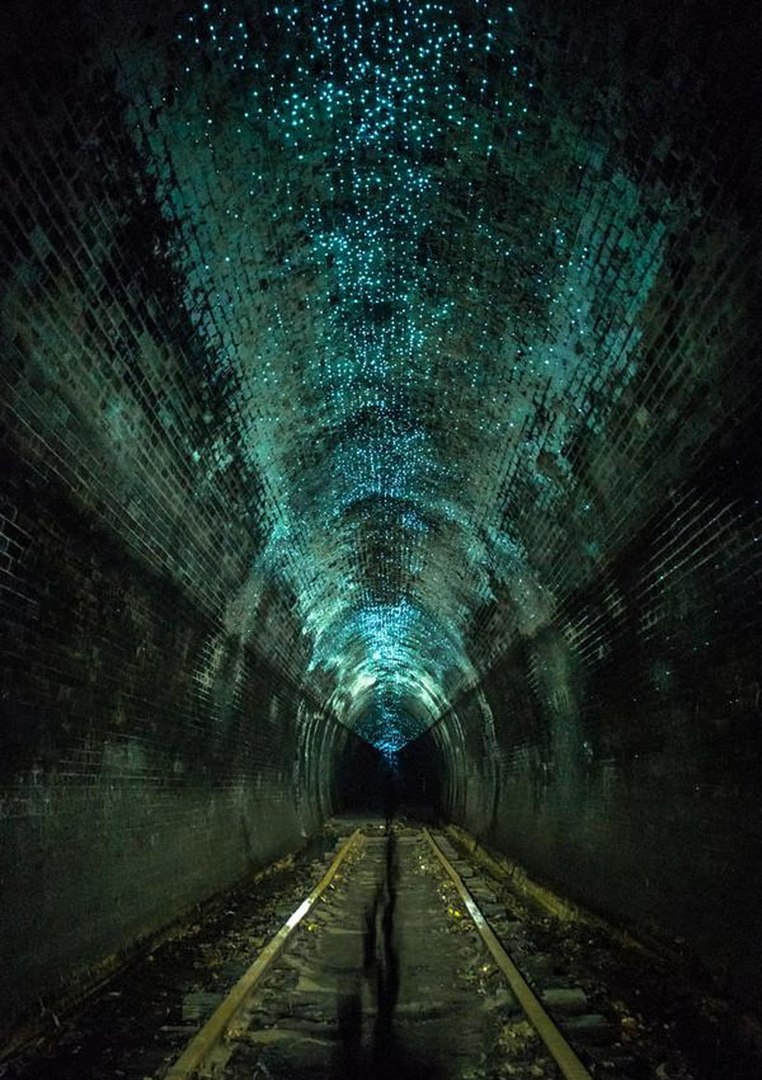 Заброшенный тоннель в Хеленсбурге, Австралия, в котором живет колония светлячков.Вид днем и вид ночью4 फोटो