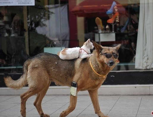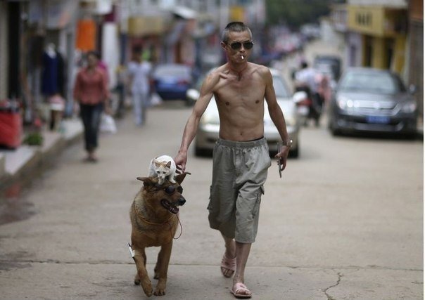 На улицах Куньмина, провинция Юньнань, можно встретить странную парочку — собаку и кошку, восседающую на товарище верхом. Зовут их Ванцай и Мими.. Хозяин животных, 42-летний отставной полицейский Сюй Цзинь удивляется столь крепкой дружбе не меньше других.4 फोटो