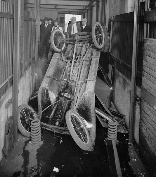 Автомобильный лифт убийца. На фотографии легендарный автомобильный лифт, который в 40-х годах прошлого века работал в Чикаго.. Сотрудники этого здания заезжали в лифт на машине, поднимались вместе с машиной на свой этаж, и так попадали в офис.. Но иногда, техника давала сбой и машины падали