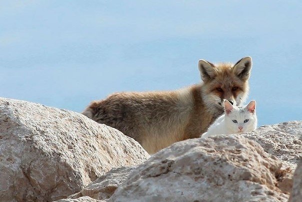 Кот и лис – лучшие друзья. На берегу озера Ван, близ одноименного города, можно увидеть эту необычную парочку друзей – кота и лиса. Местные рыбаки говорят, что впервые они увидели этих приятелей, когда те ели оставленные от улова остатки рыбы. С тех пор с8 फोटो