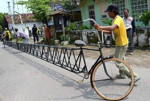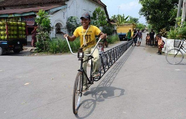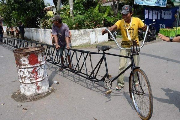 Cамый длинный велосипед сделали в Индонезии. . В Индонезии, знаменитой своими автомобильными пробками и ржавыми "консервными банками" их создающими, появилось 14.5-метровое средство передвижения, именуемое велобайком4 फोटो