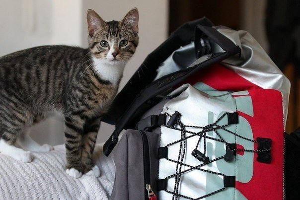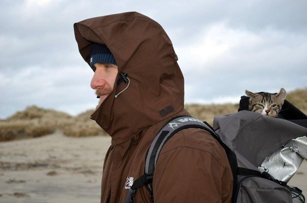 Пятимесячный котенок по кличке Хиггс с удовольствием путешествует со своими хозяевами, 30-летним Кристианом Витте и 25-летней Кимией Мохаммади, сидя в рюкзаке5 写真