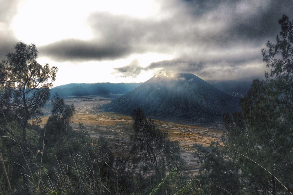 Вулкан Бромо на острове Ява. Очень атмосферное место. Рекомендую для обязательного посещения. Вулкан находится в огромном кратере другого вулкана. Кратер представляет из себя пылевую долину круглой формы с горной кряжем по краям. Советую вам взять внедорожный мот в аренду, теплые вещи, воду и еду и ехать туда на весь день. Я выезжал в 4 утра из гостиницы чтобы встретить рассвет на месте. Пасмурная погода предпочтительнее, дождь прибивает пыль. Мне повезло - прямо во время моего пребывания там началось извержение и парк закрыли. Но меня выгнать не смогли.