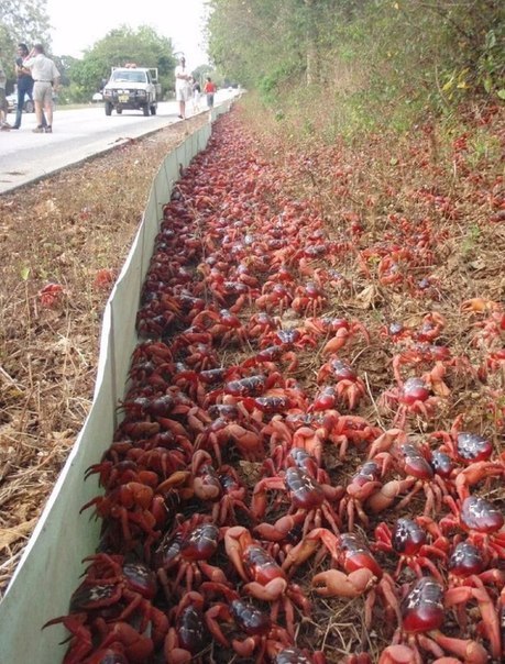 Przewalniają drogi, linie kolejowe, osady; jeździec na motocyklu może zostać porażony przez nich, pociąg może ich zgnieść, a lokalni mieszkańcy też często niszczą je. Żyje tu piętnaście gatuneków krabów. Największe z nich to kraby palmowe – giganty, których waga może sięgać trzech kilogramów. A najliczniejsze są kraby czerwone.