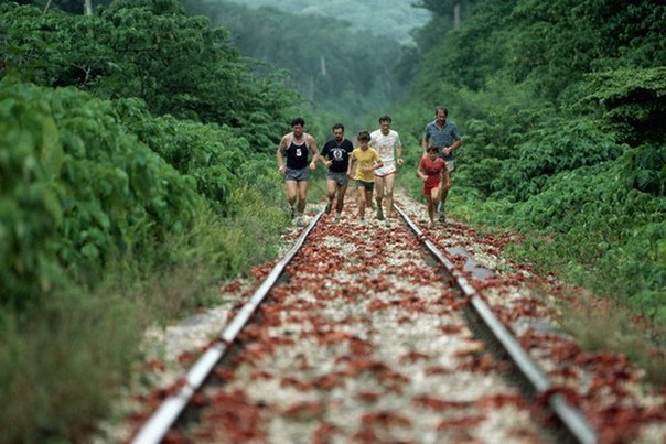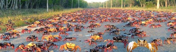 Praktycznie niemożliwe jest postąpić krok, nie rozdeptując przypadkowo jakiegoś kraba czerwonego, szczególnie w sezonie migracji, gdy przez 10 dni miliony tej zwierząt przemieszczają się w stronę wybrzeża.