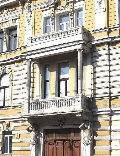 The central entrance is highlighted by a two-story balcony. The lower level is supported by statues of atlantes, while the upper level is adorned with delicate, elegant columns in the Ionic order. Above the cornice, in the center, there is a large parapet featuring a design resembling a coat of arms.