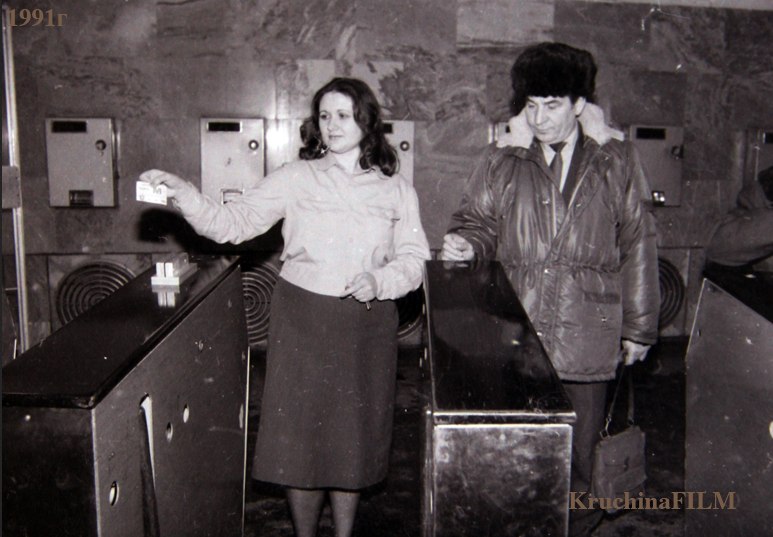 Pracownikka stacji sprawdza, czy pasażerowie znają, jak korzystać z pierwszych egzemplarów biletów,<br>stacja metra Akademia Barybaszowa, Charkiw, 1991 roku.2 zdjęć