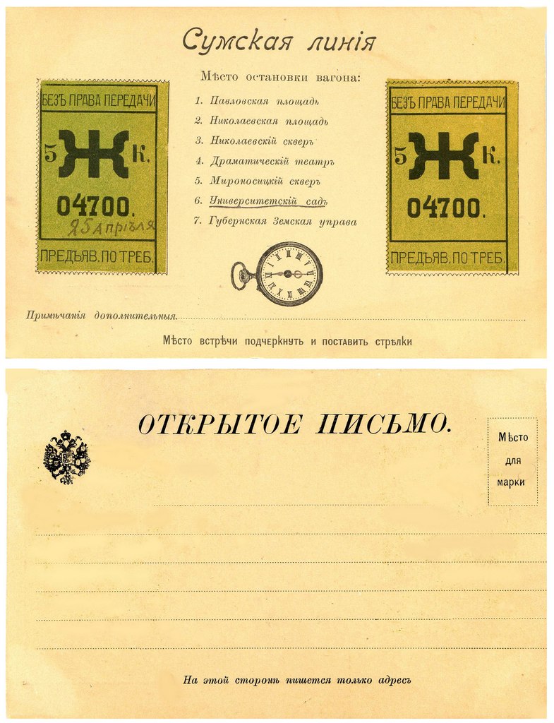 The first section of the first line of the horse-drawn tramway was opened on September 12, 1882. It ran from the intersection of Ekaterinoslavskaya Street (Poltava Road) and Aleksandrovskaya Street (Krasnoarmeyskaya Street) to Birsza market, located at the border between Nikolaevska Square and Torgova Square (now again Pavlovskaya Square). Four months later, the line was extended through Nikolaevska Square, along Moskovskaya Street and Staro-Moskovskaya Street (Moskovsky Prospect) to the Real School. Another seven months later, it was extended further along Staro-Moskovskaya Street and Konna Street (Bohdana Chmelnytskyi Street) to the Horse Market. From the very beginning, it was clear that, in a city where horse-drawn carriages were still the primary means of transport, this tramway was destined for success. The cost of a direct ride was only 5 kopecks, and with the addition of transfer points, the total cost was even lower – just one-third of the price of a carriage ride. In its first year of operation, it transported over two million passengers; in the second year, that number exceeded three million. In May 1885, the line extended to Sumskaya Street: first, a section from Veterinarna Street (now Ivanova Street) to Torgova Square was opened, and two days later, the entire second line became operational – from Veterinarna Street through the city center to Moskaliovka. The postal service also responded to this development by issuing special cards that allowed people to communicate about meeting times and locations in a way that was reliable and efficient, given the lack of a developed telephone network at that time. These cards provided a simple and effective way to share information. For our purposes, they are particularly interesting because they offer insight into the operation of this tramway system. For example, they reveal where the tram car stops along Sumskaya Street in the city center. It should be noted that fixed stopping points were not established immediately; initially, passengers could get on and off at any point along the route.
