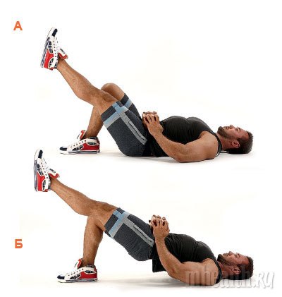 Leżąc na plecach, zgiń prawą nogę w kolencu pod kątem prostego ugała, lewą nogę wyprostuj w górę, ręce położ rozluźnionie na podłożu (A). Napięj mięśnie pośladków i uniesź biodra jak najwyżej od podłoża (B). Powróc do wyjściowej pozycji i natychmiast powtórz ruch. Wykonaj ustaloną liczbę powtórzeń – to jedna seria. Teraz odpoćznij i, zmienivšą nogę, powtórź ćwiczenie z drugą nogą.