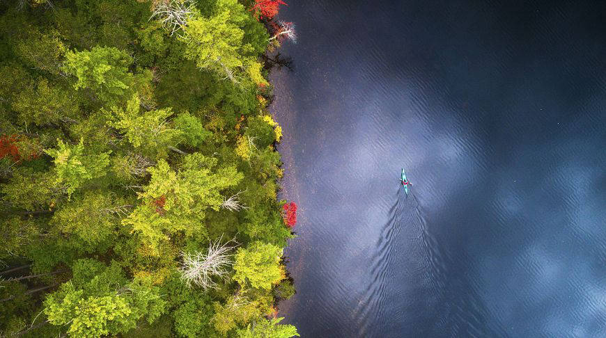Осенний заплыв на байдарке на озере штата Нью-Гемпшир, США