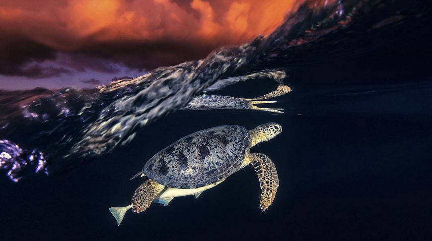 Морская черепаха в лучах заката