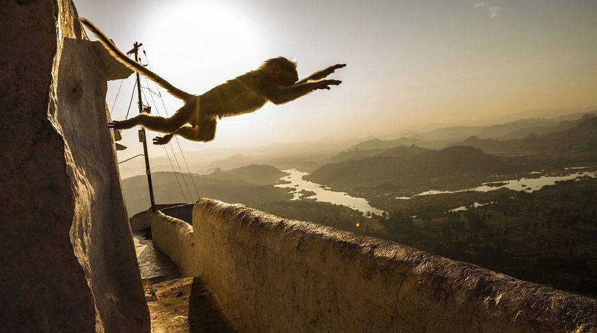 Прыжок обезьяны в храме бога Ханумана в Хампи, Индия
