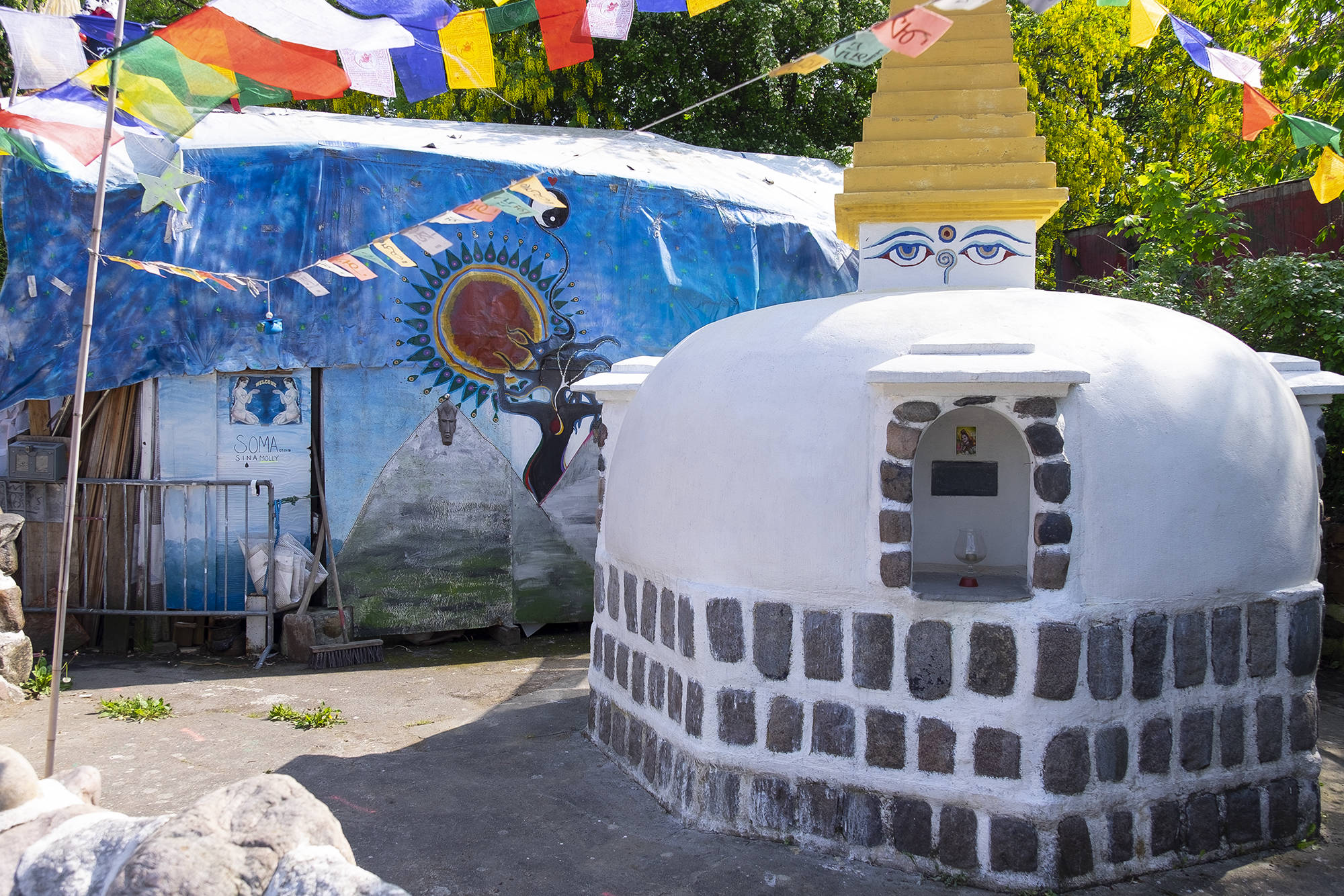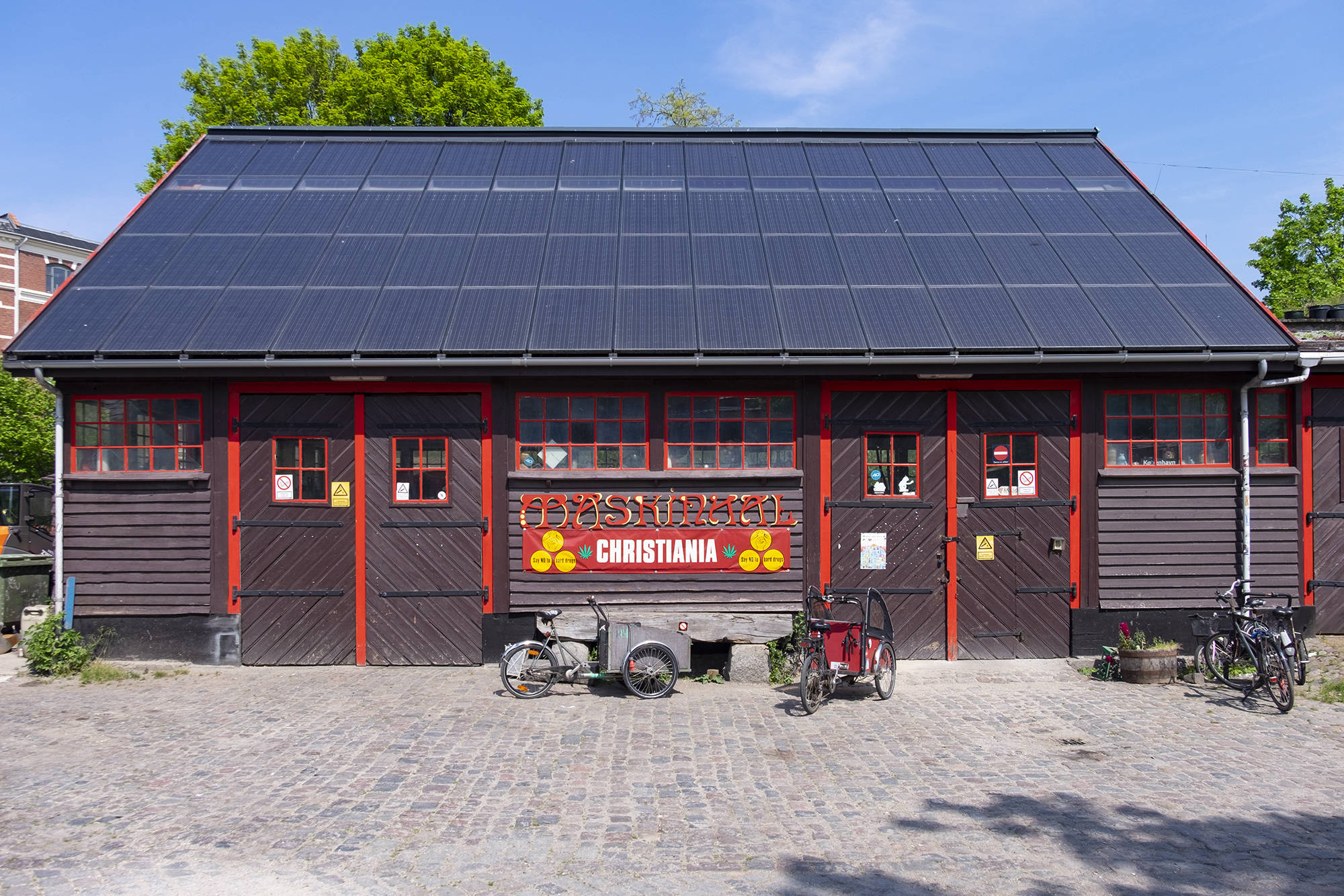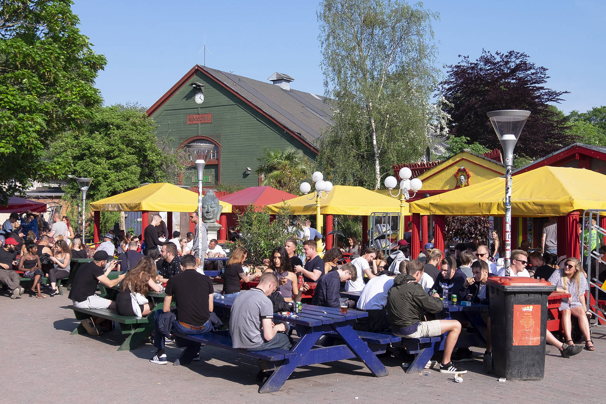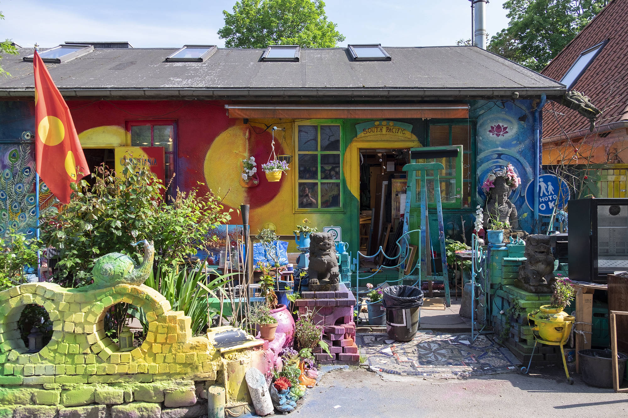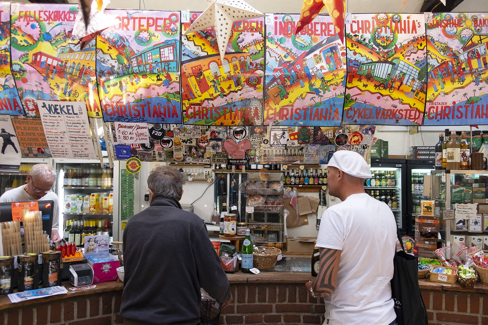 Тут есть несколько заведений фастфуда (шаурма, бургеры, салаты) и бары. Флаг Христиании - три желтых круга на красном фоне.