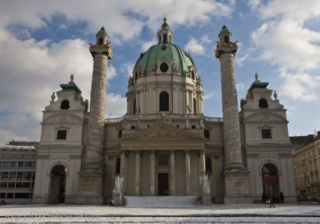 В этот раз по дороге в гостиницу я подошел к Карлскирхе, еще одному символу Вены. Это заметная католическая церковь с огромным куполом: