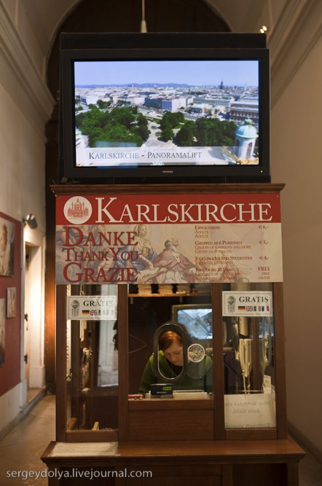 Меня привлек большой малиновый плакат справа в арке. Он предлагал мне подняться на лифте на вершину купола. При входе, над билетной кассой, специальный телевизор показывал всю красоту открывающейся сверху панорамы: