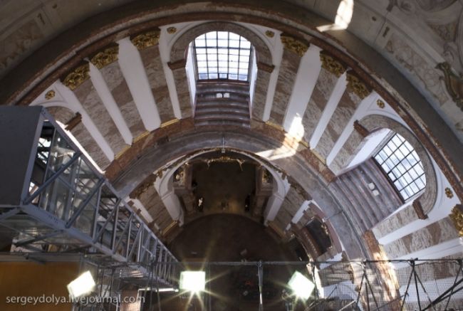 Внутри половина церкви стоит в лесах. Позже я понял, что это не строительные леса, а опора для лифта. На фотографии он слева: