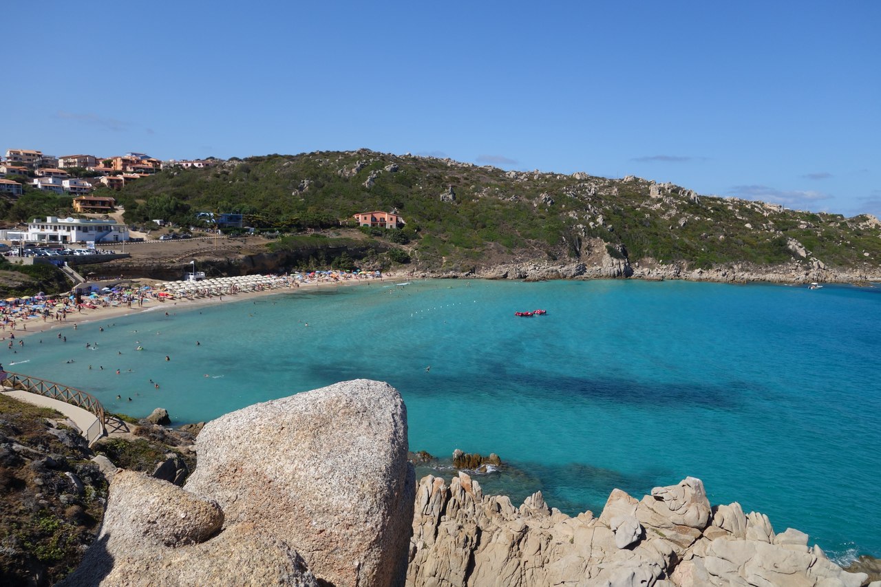 Попасть в грот можно и по морю, но мы выбрали наиболее живописный вариант. В сам грот сразу решили не идти, так как с ребёнком не самое безопасное и простое мероприятие. А вот погулять и посмотреть красоты моря и гор - это мы любим. Да и сын был счастлив шагать по ступенькам и обгонять уставших туристов. После обеда, под тихий час, мы выехали на север острова в городок Санта-Тереза Галлура. Дорога занимает пару часов. По пути часто встречаются отары овец. На Сардинии хорошо развито сыроварение. Самыми известными сырами из овечьего молока считаются "Пиккорино" и "Подда". Санта-Тереза Галлура - городок, который стоит на холмистой местности, многие улочки представляют из себя лестницы. Городской пляж Rena Bianca отмечен голубым флагом. Он небольшой, но невероятно красивый. Вообще все пляжи на Сардинии неповторимо сказочные. Приезжая на новый пляж думаешь "ну всё лучше быть не может", и так каждый раз! На пляже Rena Bianca довольно многолюдно, но при этом в море никто друг другу не мешает. Можно спокойно поплавать в водах залива Бонифачо и полюбоваться видом на Корсику. А для детей постарше и взрослых, которые любят водные развлечения, на воде есть батуты и горки. Правее от пляжа Rena Bianca есть мыс с возвышенностью, на которой стоит башня Лонгосардо. С её террасы открывается прекрасная панорама залива Бонифачо и белых скал Корсики.