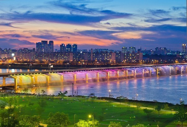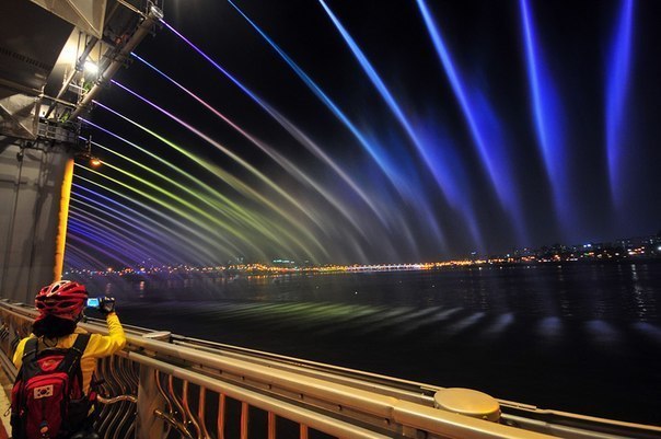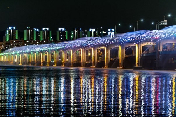 Banpo Bridge - самый большой в мире фонтан, Южная Корея.. Этот удивительный мост-фонтан, являющийся важной культурной достопримечательностью столицы Южной Кореи Сеула, считается самым длинным в мире. Его протяжность равняется 1140 метрам, благодаря этому 5 фото